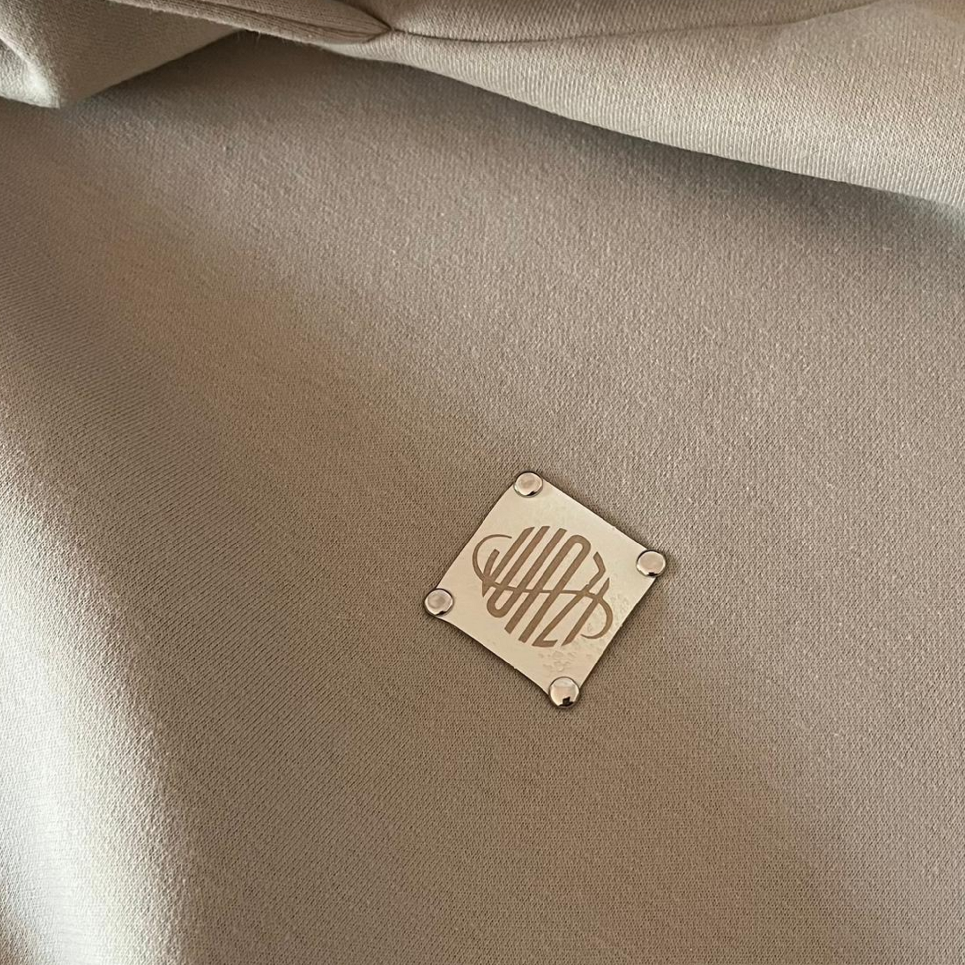 Etichetta in pelle off-white fissata sul petto con rivetti in metallo